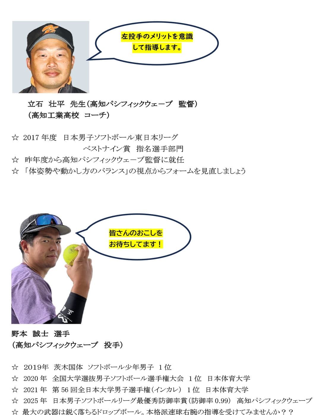 男子日本リーグ高知パシフィックウェーブの高橋速水コーチ・立石壮平監督によるピッチング指導!